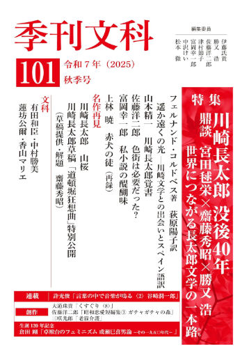 101号では、特集「川崎長太郎 没後40年」を取り上げ、冒頭の鼎談にて、勝又浩先生・宮田毬栄氏・本学卒業生の齋藤秀昭氏(川崎長太郎研究者)による「世界につながる長太郎文学の一本路」が掲載されています。また、「名作再見」では、齋藤秀昭氏の草稿提供・解題により、川崎長太郎草稿「道頓堀狂想曲」特別公開が掲載されております。この機会をお見逃しのないように、ぜひご覧ください。