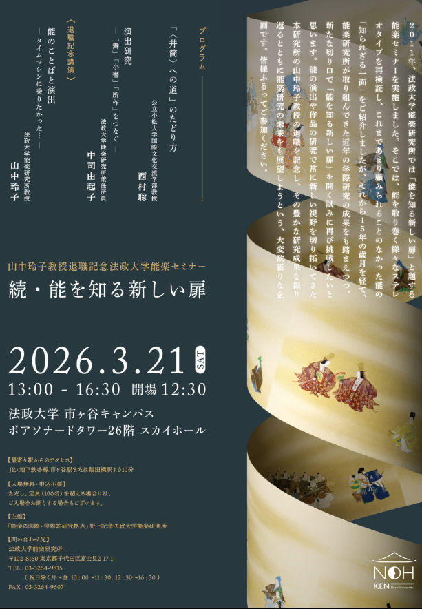 究所教授)の退職記念セミナーが開催されます。2011年に開催された、「能を知る新しい扉」に続くセミナーとなります。2025年度末をもって退職なさる山中先生により、〈退職記念講演〉能のことばと演出―タイムマシンに乗りたかった…―、中司由起子先生(法政大学能楽研究所兼任所員)により、演出研究―「舞」「小書」「所作」をつなぐ―が行われます。入場無料・申込不要ですが、定員(100名)となりますので、当日はお早めにお越しください。また、山中先生の研究に関わる、素敵なデザインの案内チラシにもご注目ください。