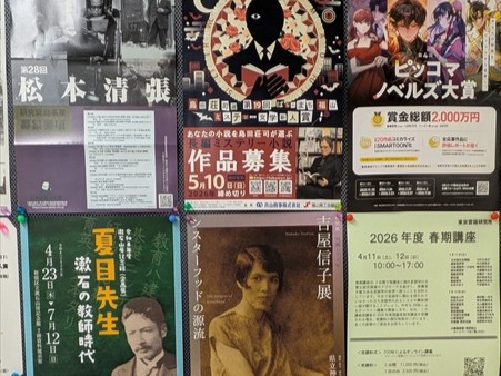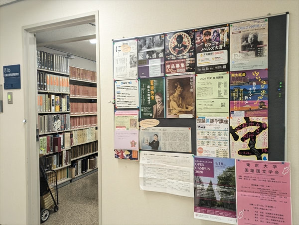 例えば、文学賞を探して応募するのもよいですし、文学フリマに足を運んでみるのもよいでしょう。講義のない空き時間を図書館で好きな本に囲まれて過ごすのもよいでしょう。そして、その選択肢の一つとして、80年館8階にある「日本文学科共同研究室」にもぜひ足を運んでください。いろんな全集を自由に読むことができますし、ドアの横にある掲示板には文学賞や文学館のチラシもいろいろ掲示してありますので、皆さんにとって新しい発見・出会いがあるかもしれません。