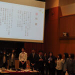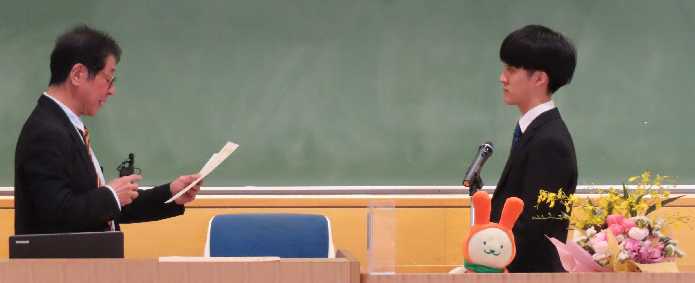 法政大学での思い出や感謝などを綴った挨拶がありました。また、文学部同窓会特別奨励賞には、法政大学落語研究会部長を務め、第21回全日本学生落語選手権にて見事優勝を飾った、早瀬太亮さん(中丸ゼミ)が表彰されました。