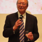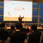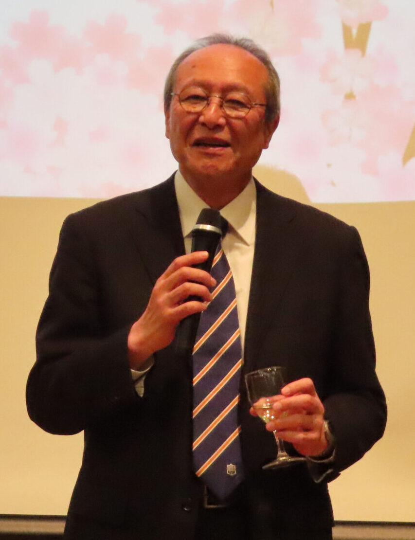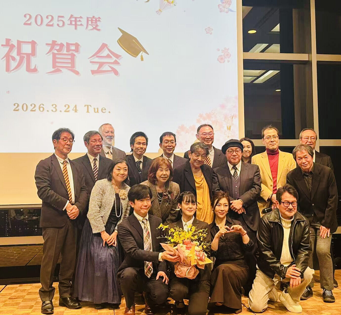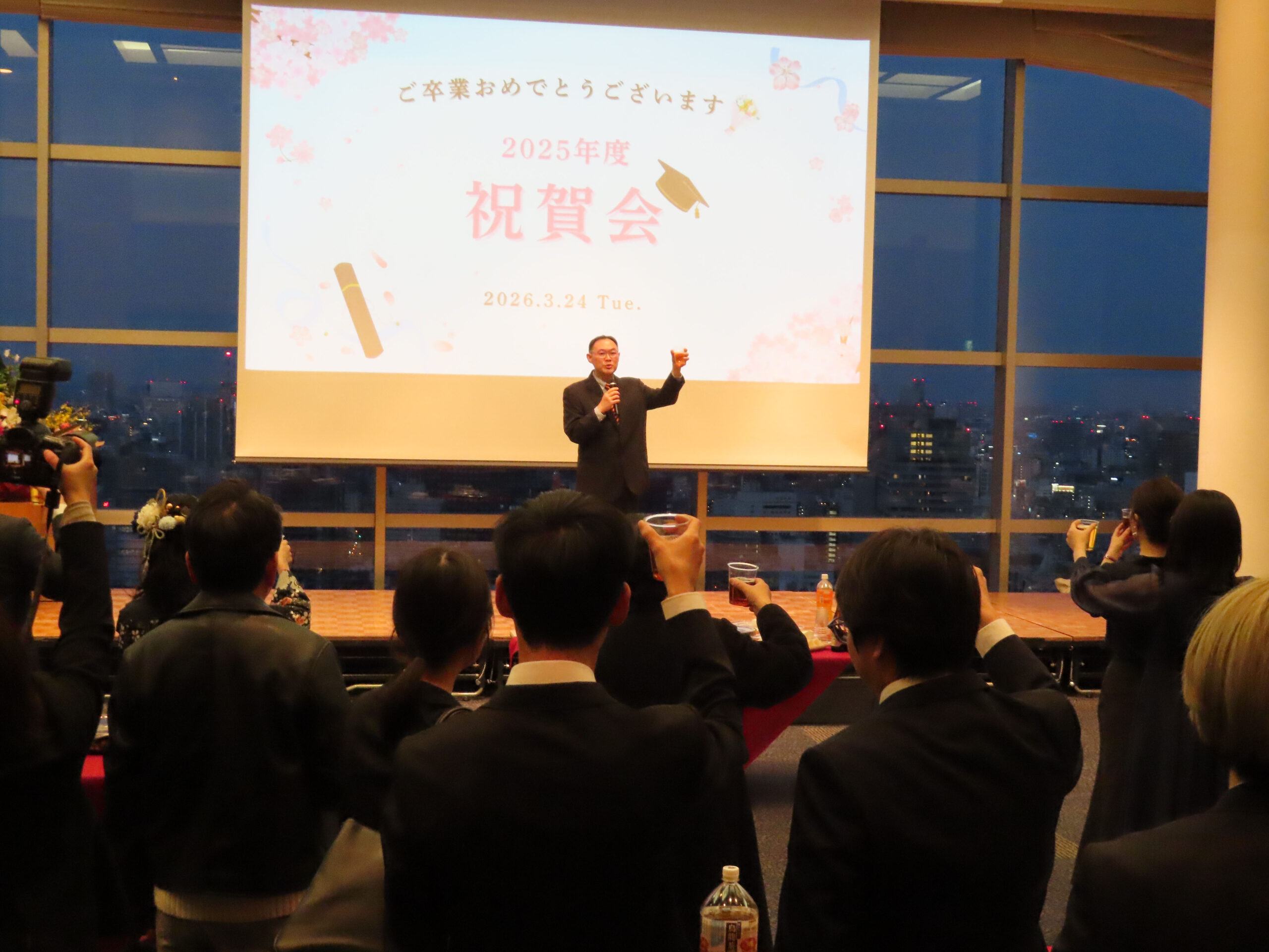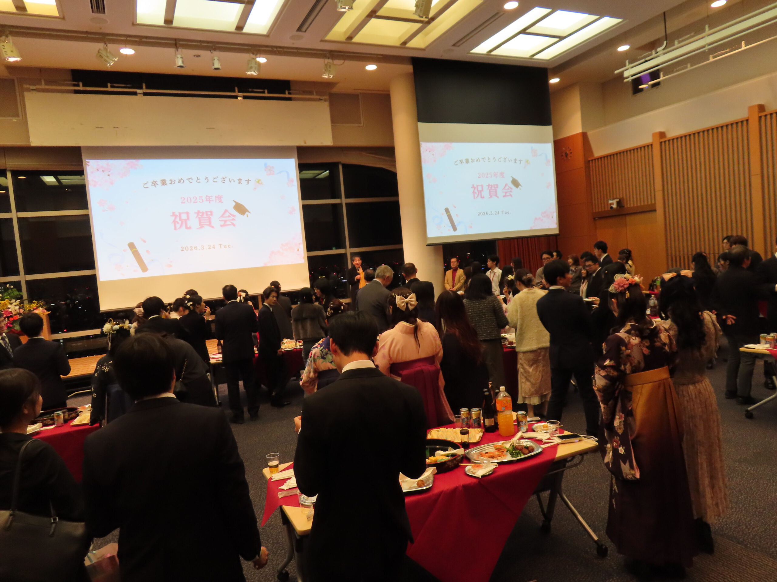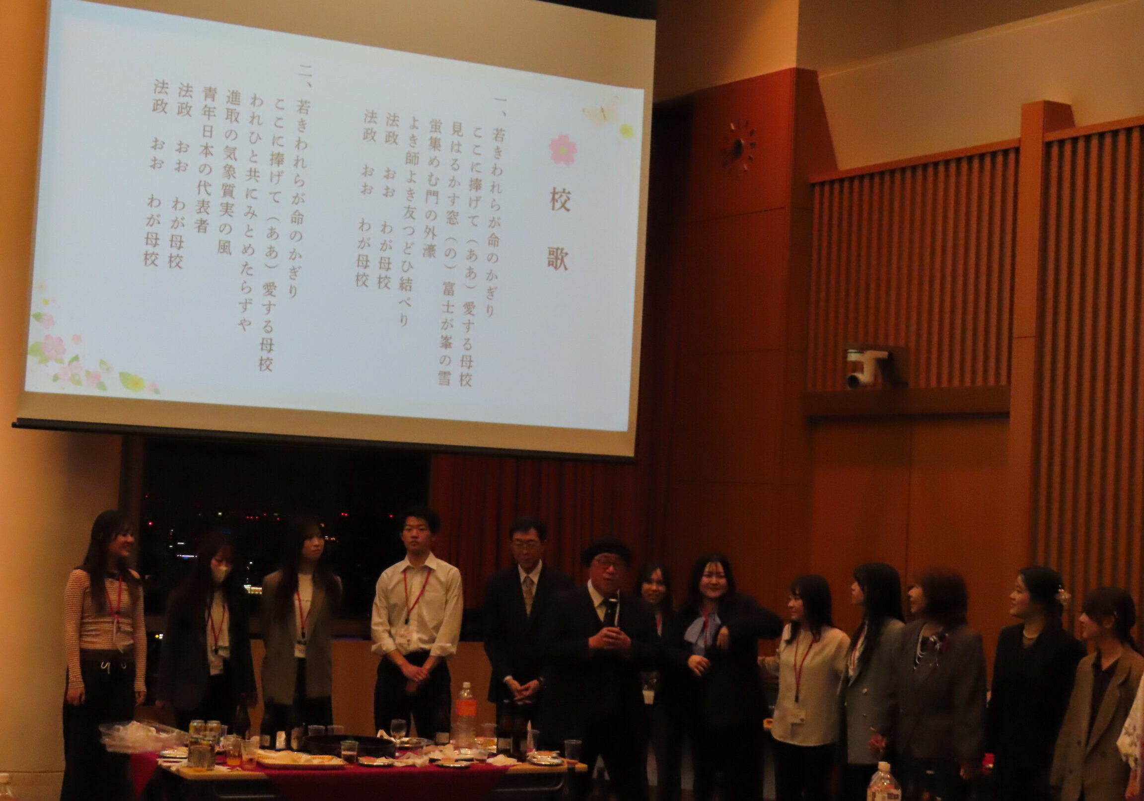 18:00からは、ボアソナードタワー26階のスカイホールにて、日本文学科卒業祝賀会「卒業生を励ます会」が催されました。日本文学科では、新たな門出を迎えた卒業生を励ますために、法政大学国文学会と日本文学科学生委員会が中心となり、「卒業生を励ます会」が伝統的に催されています。先生方の近況報告や、2024年度をもってご退職された坂本勝先生のサプライズ登場、また山