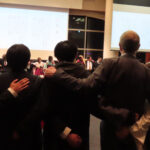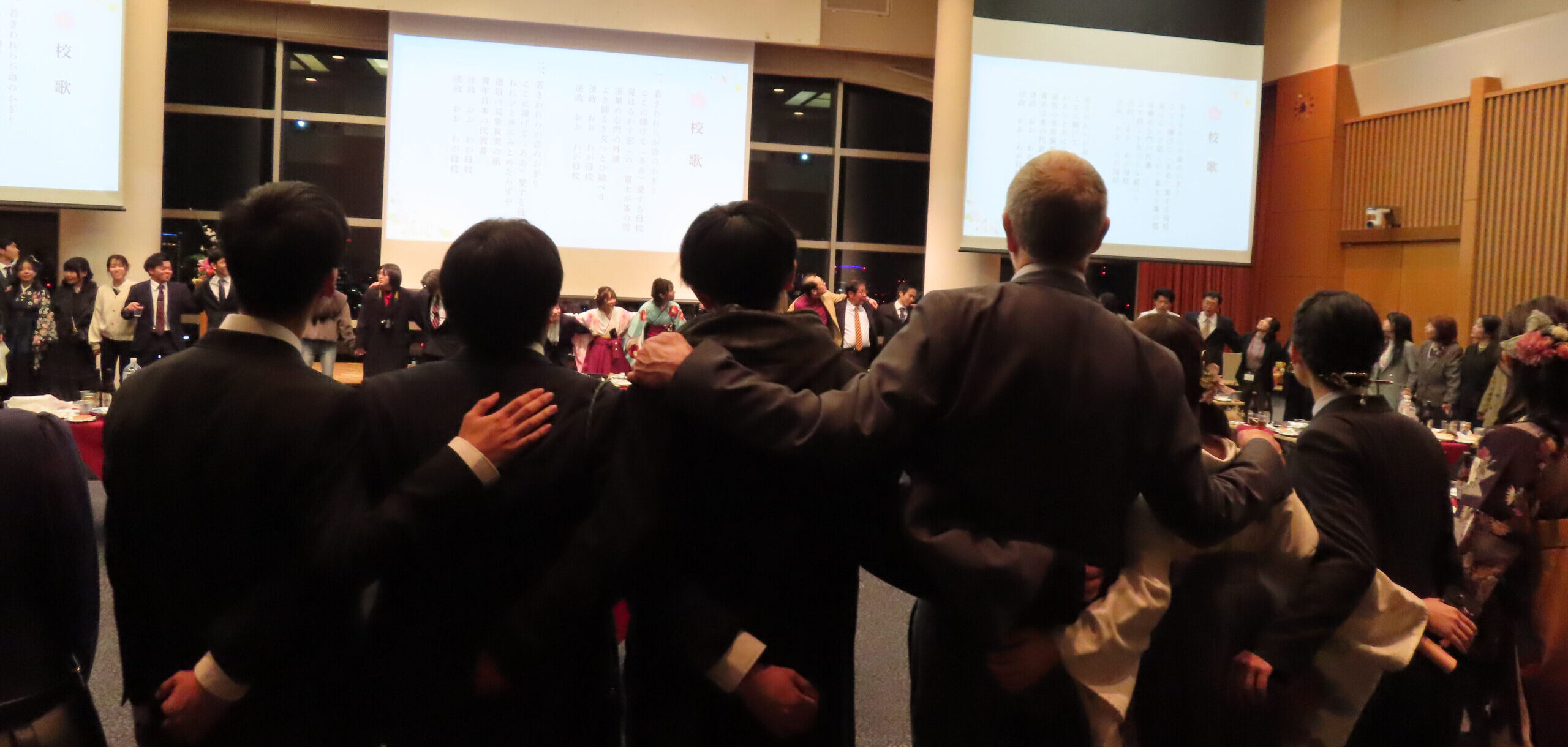 によるビンゴゲーム大会や先生方からのサプライズ企画などで和やかな雰囲気の中、最後には、藤村耕治先生の音頭による、恒例の肩を組んで校歌の大合唱!会は盛況のうちに終了しました。歓迎会を企画していただきました学生委員会の皆さま、ありがとうございました。